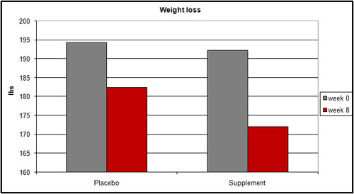Figure 1: In an eight week period with all things equal, the Loleptin group lost ~8.5 lbs more than the placebo group or 92% more weight.